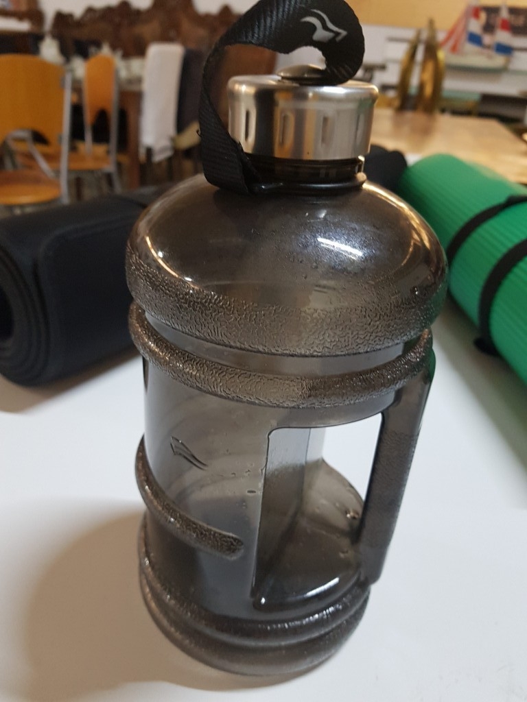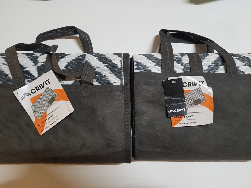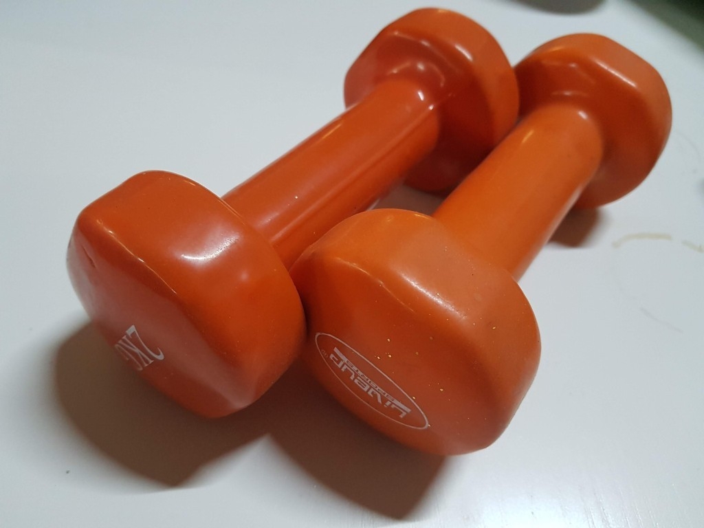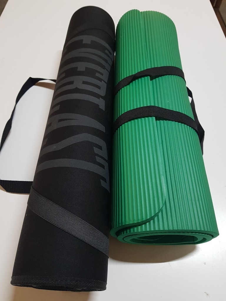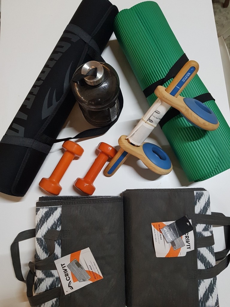 Gym Accessories; Wooden Pelvic Correction Device and Pair of 2kg (Each) Vinyl Dumbbells, 2x Exercise Mats (One EVERLAST), 2x Beach Exercise Mats (CRIVIT), Large Water Bottle. (8)