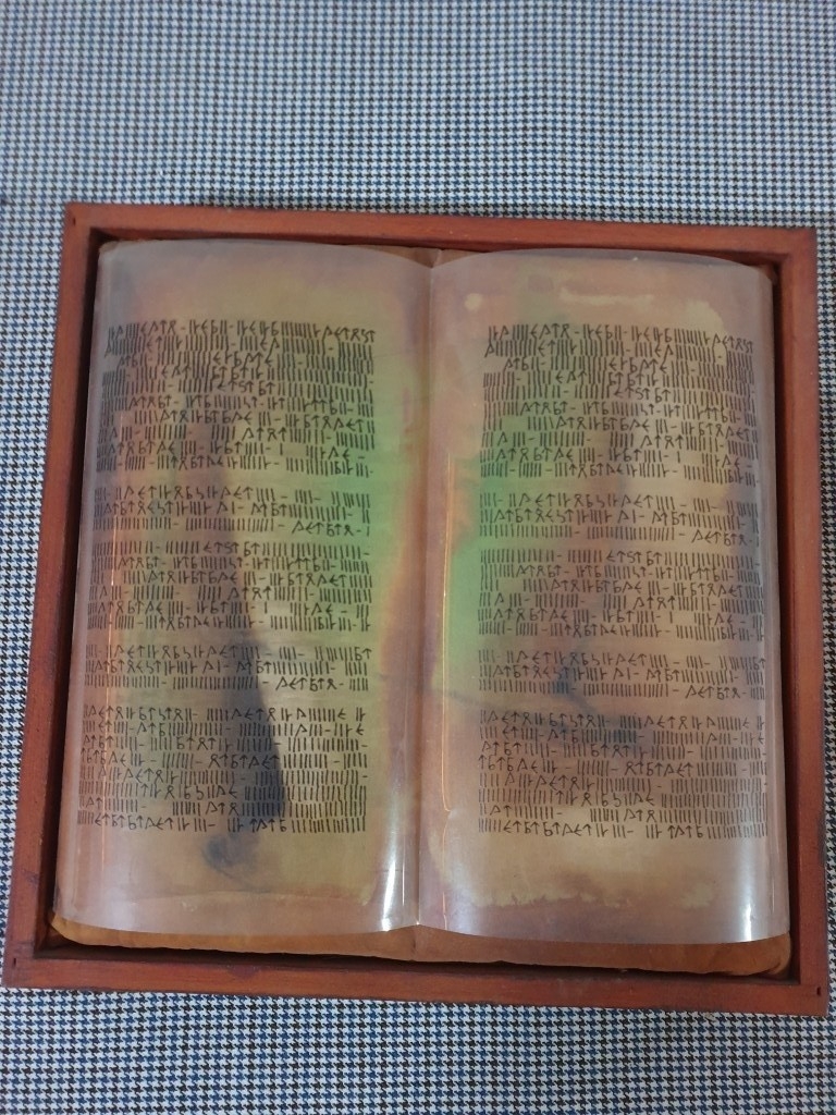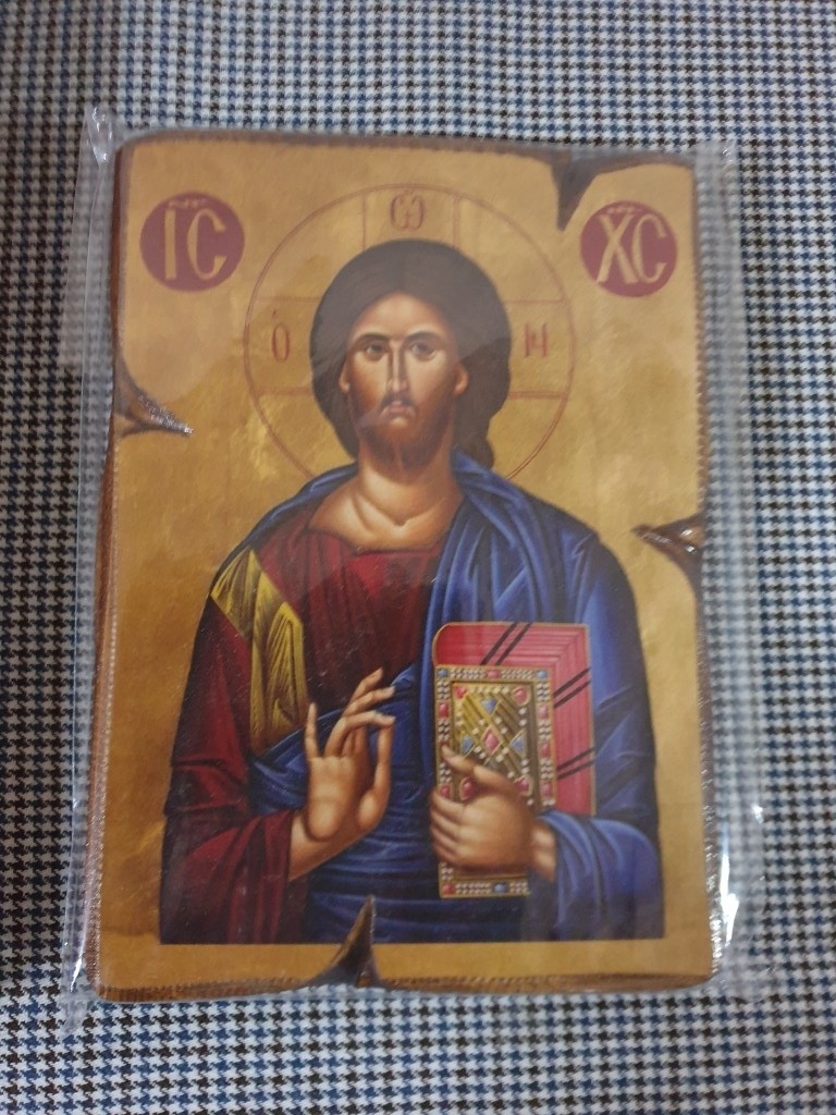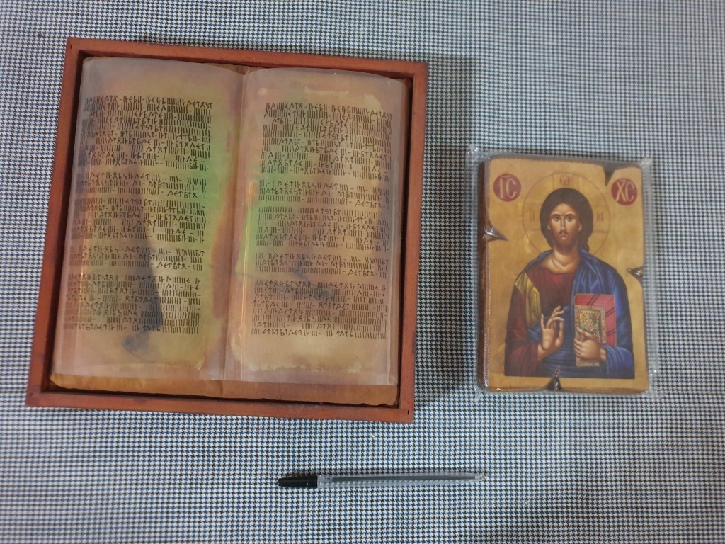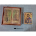Replica Of the 'Silver Bible' Together With A wooden Icon Of Jesus Christ.