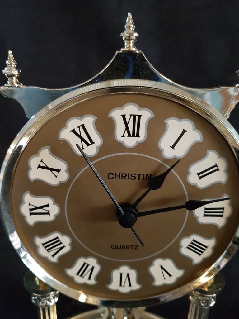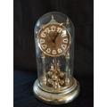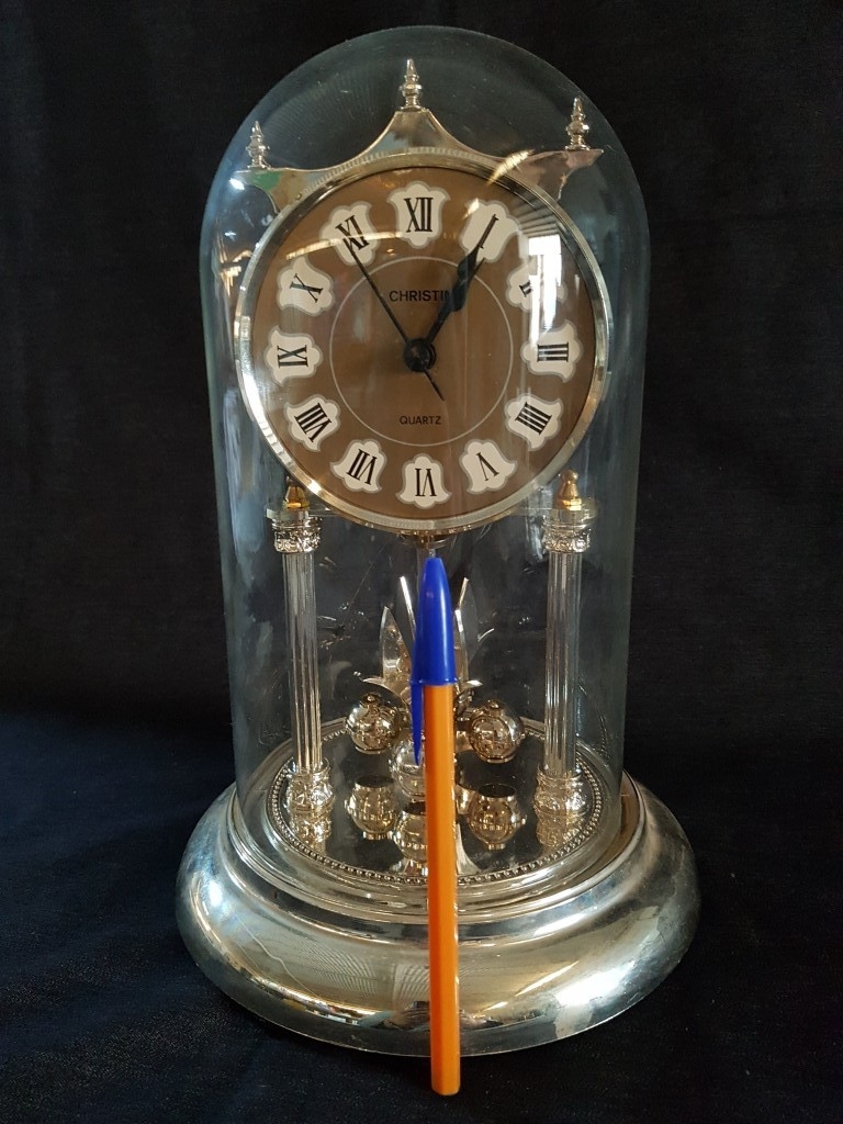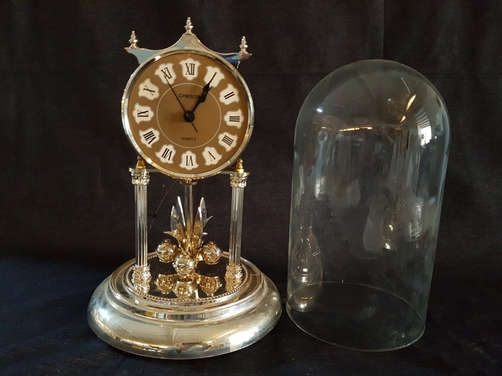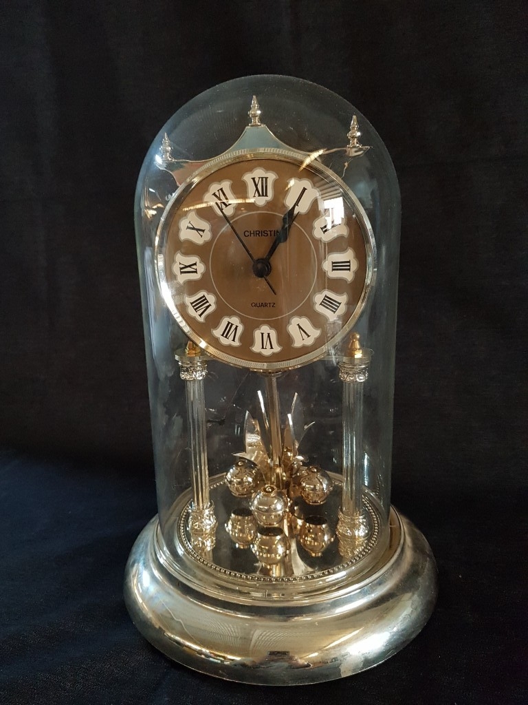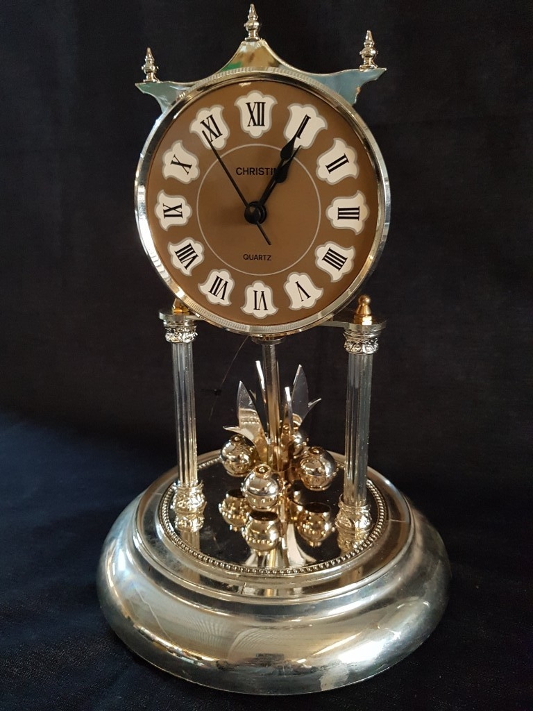 'Christin' Gold-Toned Quartz Anniversary Clock with Glass Dome, Roman Numeral on Face and Gold- Colored Mechanism with Rotating Pendulum (Approx. H: 29cm), * Clock Running But 4-Ball Pendulum Requires Re-Hanging or Attention *