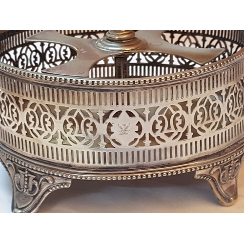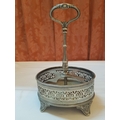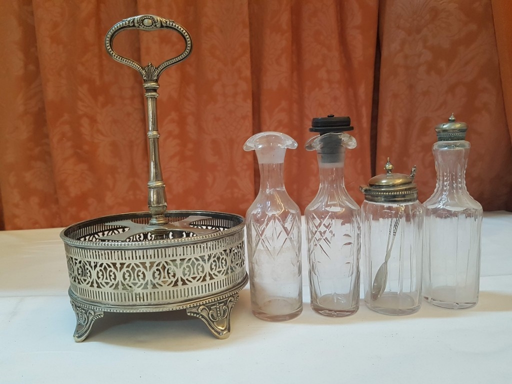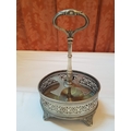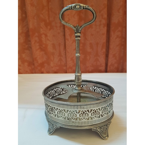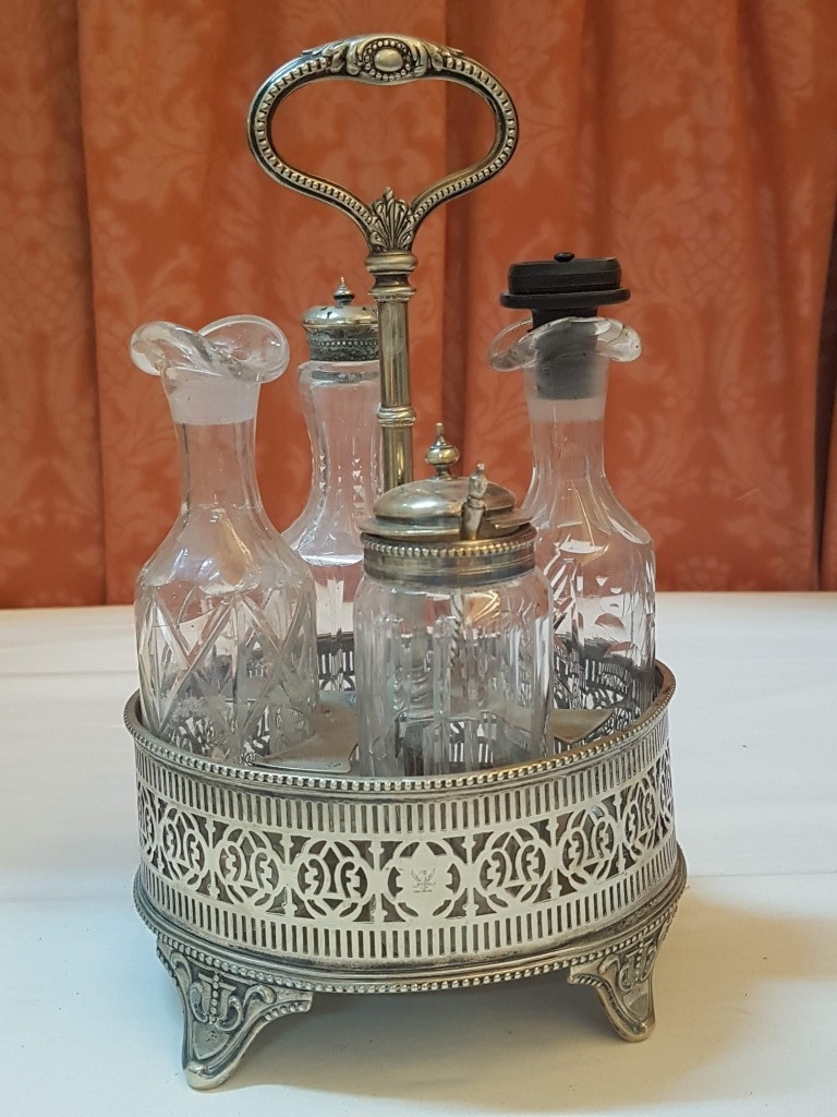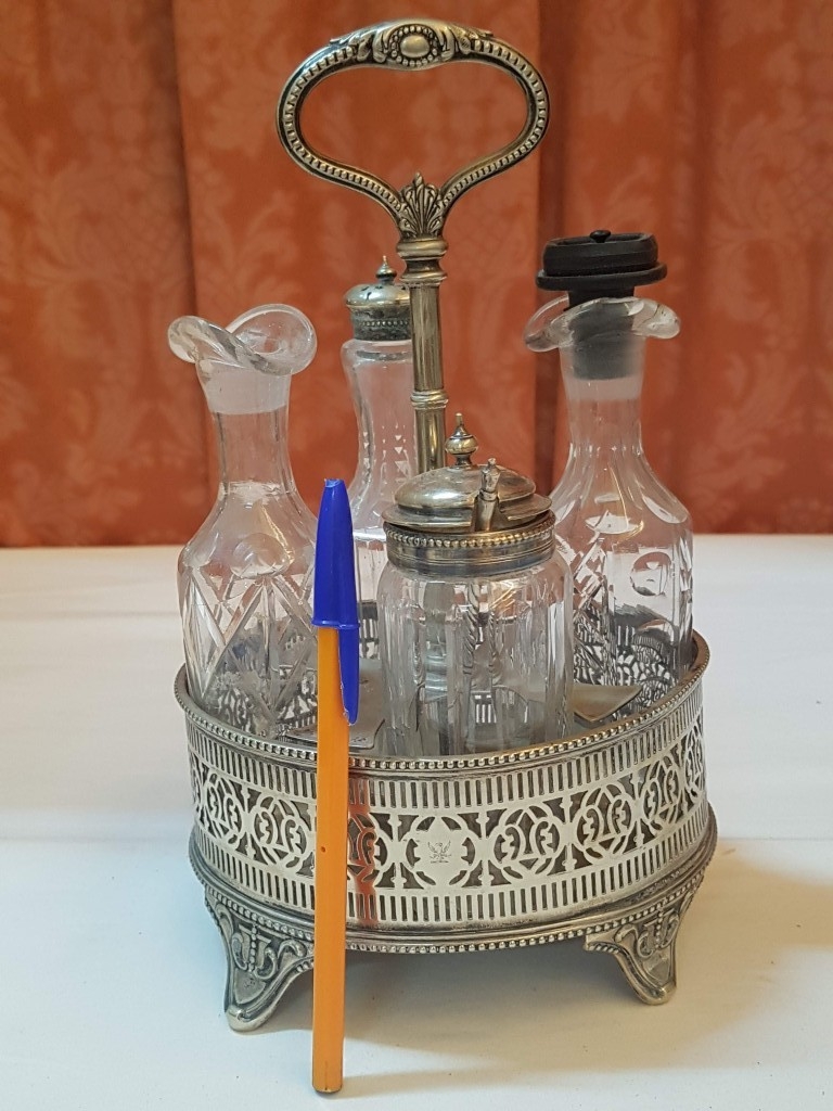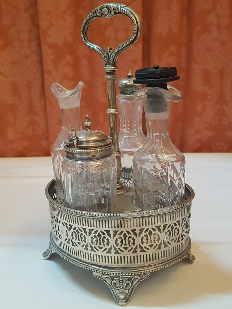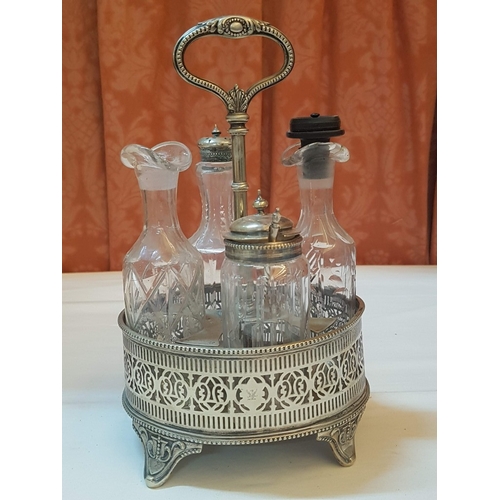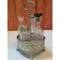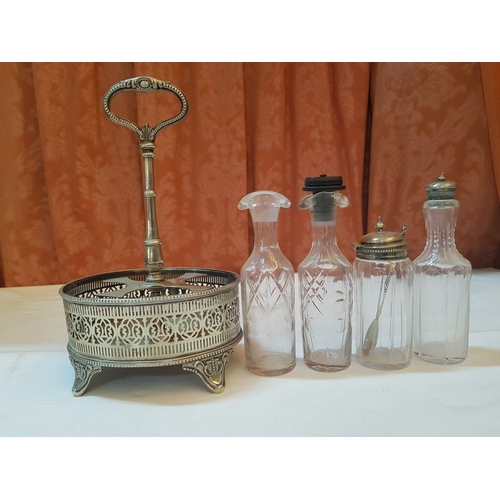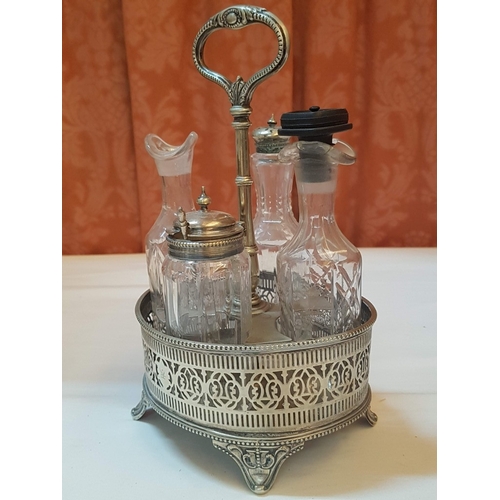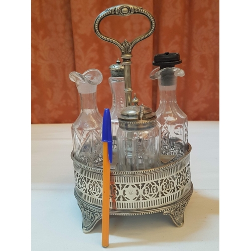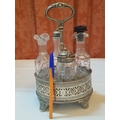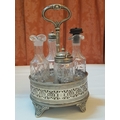 Vintage EPNS Cruet Set with Cut and Beveled Glass Bottles/ Cruet Condiment Tabletop Set in Ornate Footed Tray Stand with Carry Loop Handle, Circa 1950s,