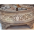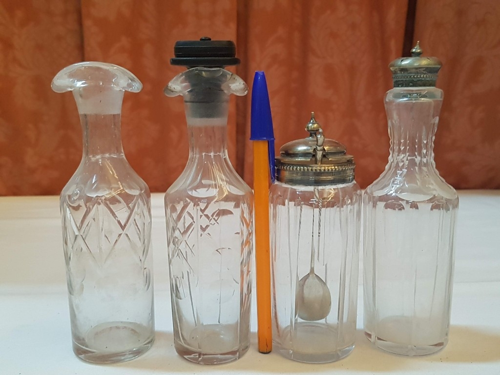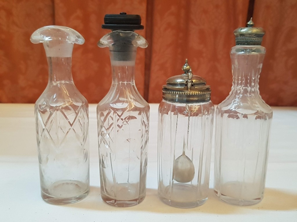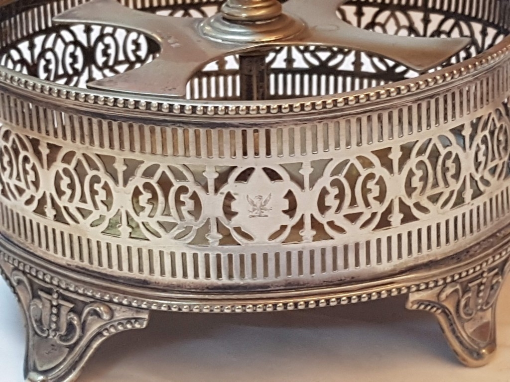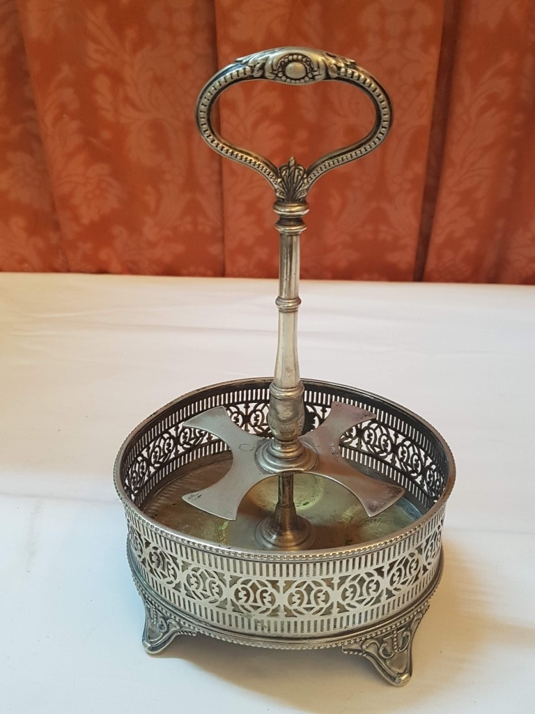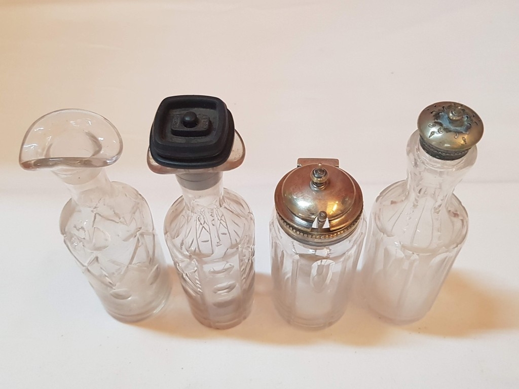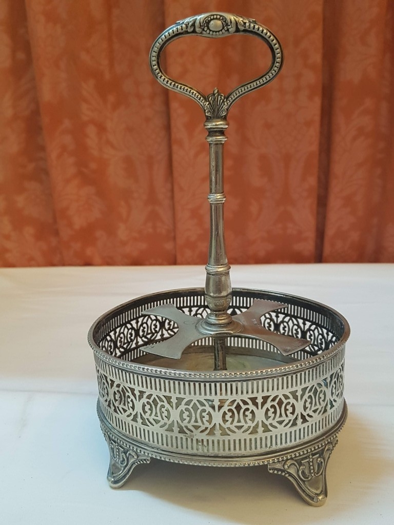 Vintage EPNS Cruet Set with Cut and Beveled Glass Bottles/ Cruet Condiment Tabletop Set in Ornate Footed Tray Stand with Carry Loop Handle, Circa 1950s,